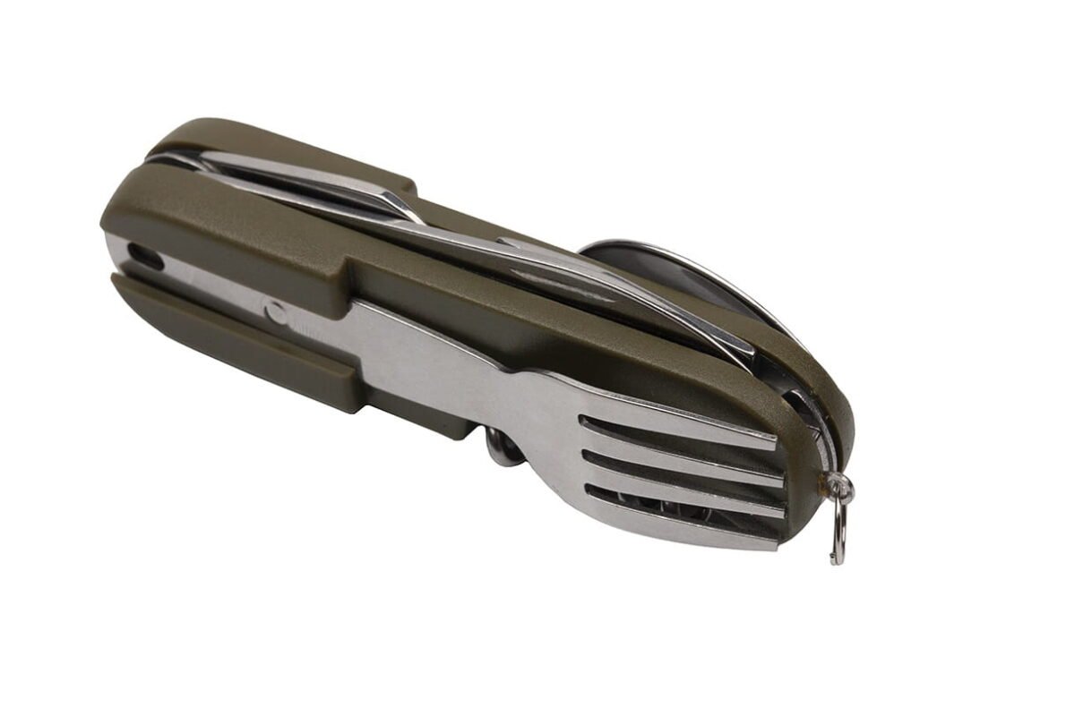 Į komplektą įeina: peilis, šakutė, šaukštas, skardinių atidarytuvas, butelių atidarytuvas, kamščiatraukis, kaltas, plokščias atsuktuvasIlgis sulankstytas: 10,5 cmPlotis: 2,5 cmSvoris: 120 gSvoris su dangteliu: 130 gPeilio ašmenų ilgis: 7 cmŠakės ilgis, šaukštai: 10,2 cmŠakės ilgis, šaukštai, sumontuoti rankenoje: 16,2 cm