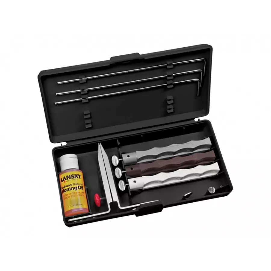 Lansky LKNAT – profesionalus peilių galandinimo rinkinys su trimis natūraliais „Arkansas“ akmenimis, reguliuojamu kampu ir tvirtu spaustuvu. Sistema skirta tiksliam ir švariam galandinimui, užtikrinančiam ilgai išliekančią aštrumą.