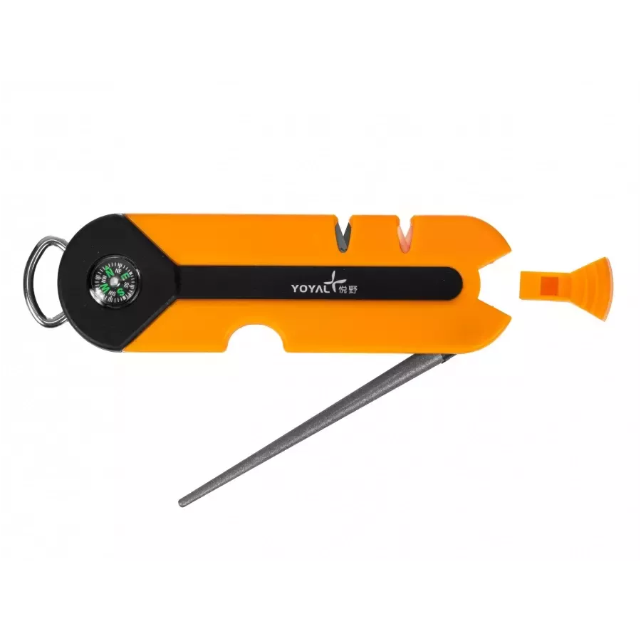 Taidea TY1805 yra daugiafunkcis turistinis galąstuvas su 3 galandimo zonomis, avariniu švilpuku, kompasu ir plieniniu segtuku. Lengva, patvari Taidea TY1805 konstrukcija puikiai papildys kiekvieno lauko ir išgyvenimo entuziasto EDC komplektą. Galąstuvas yra nedidelis, lengvos polimerinės konstrukcijos ir praktiško plieninio segtuko, leidžiančio jį pritvirtinti prie kuprinės, raktų ar įrangos. Turistinį pobūdį pabrėžia ir kontrastinga juodos ir oranžinės spalvos gama, kuri palengvina greitą galąstuvo vietos nustatymą tarp kitos įrangos ar augmenijos. Trys galandimo zonos Nepaisant nedidelio dydžio, galąstuvas turi net 3 galandimo zonas: kūginį deimantinį strypą dantytais ašmenimis galąsti, keraminį V formos galąstuvą greitam papildomam galandimui ir poliravimo V formos galąstuvą iš volframo karbido, skirtą labai atšipusių pjovimo briaunų šlifavimui. Verta prisiminti, kad karbidas itin agresyviai nuima plieną, todėl galandant peilio spausti nereikia, pakanka švelniai traukti, naudojant paties įrankio svorį. Galąsti V tipo galąstuvais yra itin paprasta ir nereikalauja patirties – tereikia keletą kartų patraukti ašmenis per galandimo angą, kol pasieksite patenkinamą aštrumą. Dėl šios funkcijos Taidea TY1805 yra puikus pasirinkimas žmonėms, ieškantiems paprasto ir efektyvaus galąstuvo lauko peiliams. Papildomos turizmo funkcijos Be pagrindinės funkcijos, Taidea TY1805 siūlo papildomus sprendimus ir funkcijas. Lansky Road galąstuvas turi įmontuotą atsarginį kompasą orientacijai lauke ir ištraukiamą gelbėjimo švilpuką, skleidžiantį aukštą ir garsų garsą. Ką galima galąsti? Mėsos peilis Sulankstomas peilis Peilis su kabliu Universalus peilis Skeltuvas Universalus Santoku peilis Virėjo peilis Dantytas peilis Papildomos funkcijos Švilpukas Kompasas