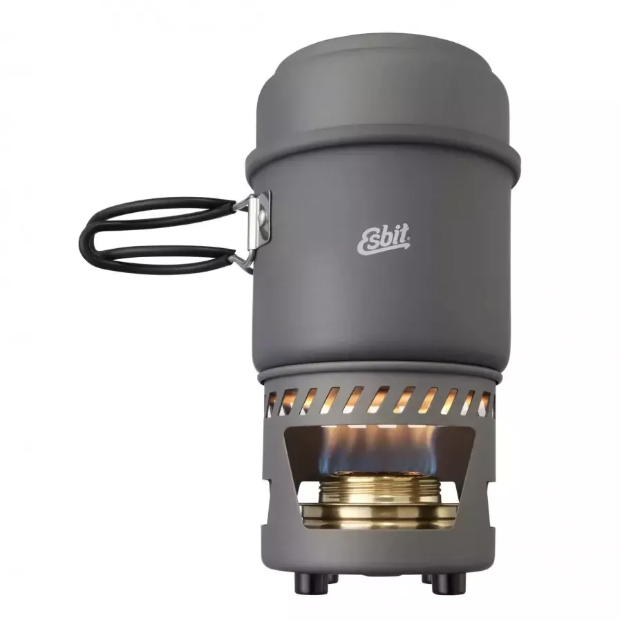 Esbit Cookset yra lengvas ir kompaktiškas maisto ruošimo rinkinys vienam asmeniui. Tai bus patvarus sprendimas ieškantiems patikimos įrangos maistui gaminti gamtoje. Rinkinį sudaro 985 ml puodas, dangtelis, kuris taip pat gali būti naudojamas kaip keptuvė (470 ml), spirito degiklis su stabilia atrama. Visos talpyklos pagamintos iš anoduoto aliuminio, todėl jos yra lengvos, patvarios ir atsparios korozijai. Sulankstomos rankenos palengvina transportavimą, o ant puodo esantys įspausti matavimo ženklai leidžia tiksliai atmatuoti skysčius. Dangtelis pagreitina virimą ir gali būti naudojamas kaip lėkštė ar maža keptuvė. Esbit Cookset rinkinio ypatybės: Elementai pagaminti iš anoduoto aliuminio ir vario. Rinkinyje rasite žalvario spirito degiklį su įmontuotu liepsnos gesinimo mechanizmu. Puodo dugnas taip pat tarnauja kaip degiklio gaubtas, padidinant jo universalumą. 985 ml puodas turi įspaustus matavimo ženklus, palengvinančius visų skysčių matavimą. Rinkinį sudaro 470 ml talpos dangtelis, kuris gali būti naudojamas kaip keptuvė. Pagrindas suderinamas su Esbit kietuoju kuru, leidžiantis naudoti alternatyvius maisto ruošimo būdus. Rinkinyje yra du tinklelio maišeliai su raišteliais. Maitinamas spirito degikliu Rinkinys aprūpintas žalvario degikliu, kuris maitinamas spiritu. Jame yra liepsnos gesintuvas, o stabilus pagrindas leidžia gaminti maistą net ant nelygaus paviršiaus. Papildomai rinkinys turi metalinę atramą, skirta naudoti su Esbit kietuoju kuru.